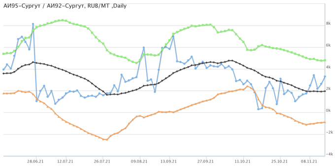 Разница цен между 95-м и 92-м бензином на базисе Сургут (Ханты-Мансийский а.о.).