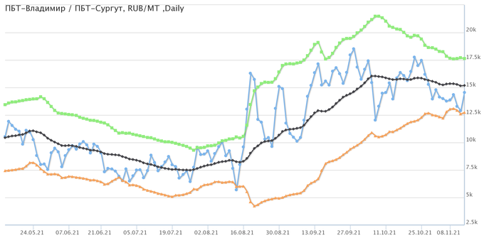 Разница цен между ПБТ на базисе Владимир и ПБТ на базисе Сургут (Ханты-Мансийский а.о.).