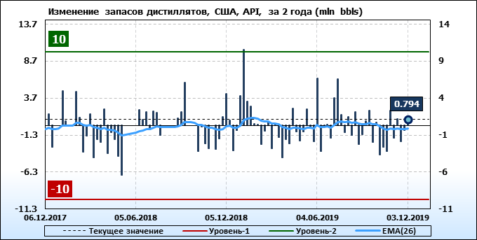 Запасы дистиллятов в США по данным института API выросли на 0.794 млн. баррелей.