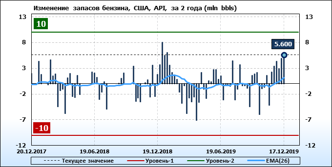 Запасы бензина в США по данным института API выросли на 5.6 млн. баррелей.