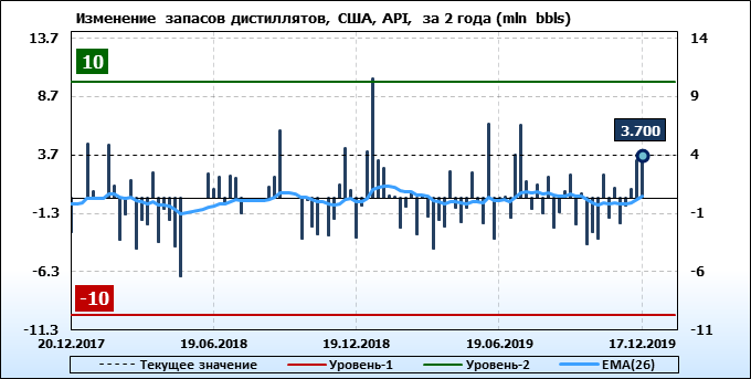 Запасы дистиллятов в США по данным института API выросли на 3.7 млн. баррелей.