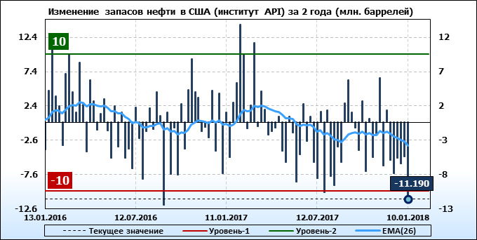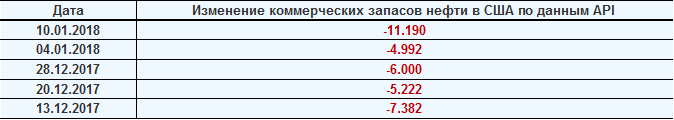 Изменение запасов нефти в США (институт API). Данные на 10.01.2018