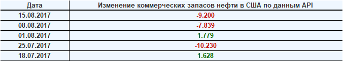 Изменение запасов нефти в США (институт API). Данные на 15.08.2017