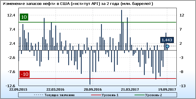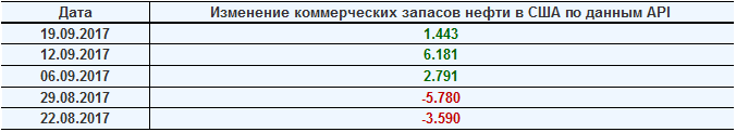 Изменение запасов нефти в США (институт API). Данные на 19.09.2017