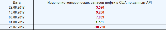 Изменение запасов нефти в США (институт API). Данные на 22.08.2017