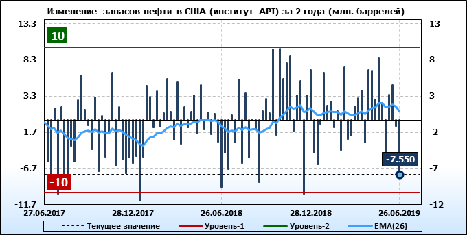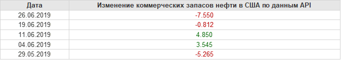 Изменение запасов нефти в США (институт API). Данные на 26.06.2019