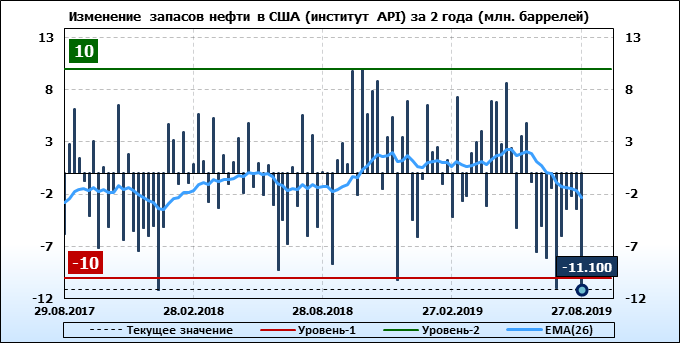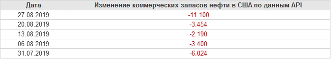 Изменение запасов нефти в США (институт API). Данные на 27.08.2019