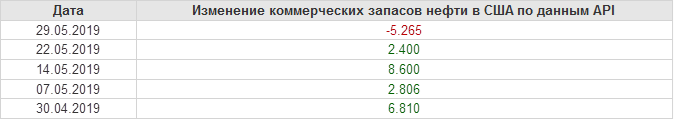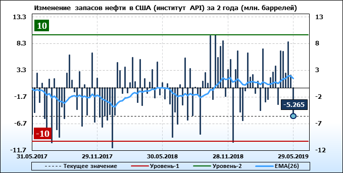 Изменение запасов нефти в США (институт API). Данные на 29.05.2019