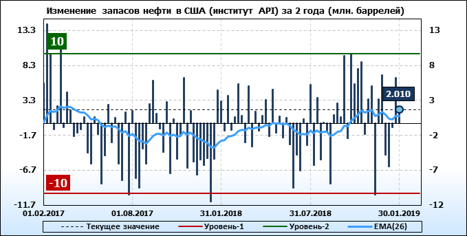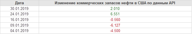 Изменение запасов нефти в США (институт API). Данные на 30.01.2019