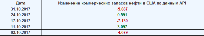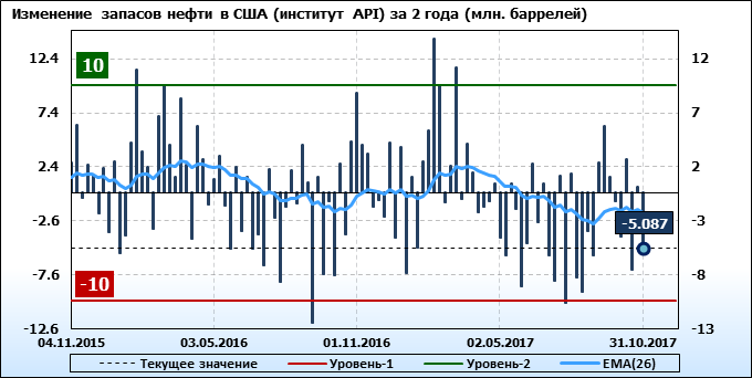 Изменение запасов нефти в США (институт API). Данные на 31.10.2017