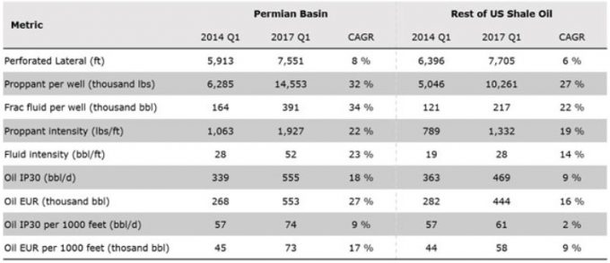 На рисунке 1 представлена сводка по основным параметрам скважин, интенсивности освоения и по показателям производительности горизонтальных скважин в Permian Basin и в остальных сланцевых регионах США, основными из которых являются Bakken, Eagle Ford, Niobrara, SCOOP и STACK. В таблице указаны средние значения для первого квартала 2014 года и для первого квартала 2017 года.