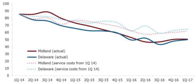 На рисунке 2 изображено поквартальное изменение цены на WTI в Permian Midland и Delaware. Жирные линии показывают фактическое изменение цен, а пунктирные линии — предполагаемое изменение цен при условии неизменности стоимости сервисного обслуживания с первой четверти 2014 года.
