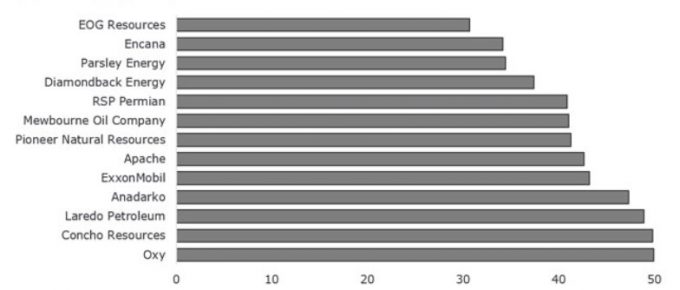 EOG Resources, Encana, Parsley Energy и Diamondback Energy демонстрируют цены безубыточности менее 40 USD за баррель. Все другие добытчики демонстрируют коммерческую активность на уровне до 50 USD. В 2017-2018 годах ожидается дальнейшее развитие наклонно-направленного бурения и большая активность по освоению скважин. Таким образом, возросшая недавно стоимость производства будет компенсирована более интенсивным бурением и производительностью скважин.
