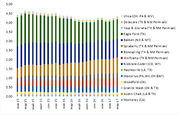 Рис. 3. Добыча сланцевой нефти по плеям, данные суммированные из сообщений регуляторов штатов, млн барр./сут.