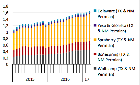 Рис. 5 — Добыча сланцевой нефти по плеям бассейна Permian, млн барр./сут.