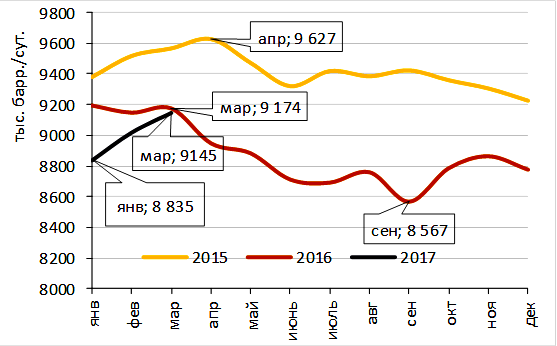 Для текущих расчетов добычи берется количество буровых установок на дату двухмесячной давности (два месяца – это тот срок, когда пробуренная скважина заканчивается, подсоединяется к трубопроводной инфраструктуре и дает первую добычу, в которой уже не содержится буровой раствор). После этого наступает первый месяц добычи, который и идет в расчет.