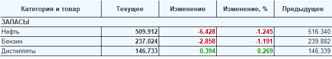 Коммерческие запасы нефти в США упали на -6.428 до 509.912 млн. баррелей. Запасы бензина упали на -2.858 до 237.024 млн. баррелей. Запасы дистиллятов выросли на 0.394 до 146.733 млн. баррелей.