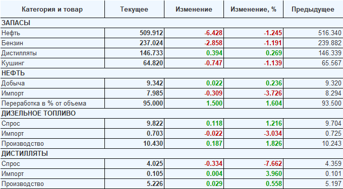 Переработка нефти выросла на 1.5 до 95 процентов. Производство нефти выросло на 0.022 до 9.342 млн. баррелей. Импорт нефти упал на -0.309 до 7.985 млн. баррелей.