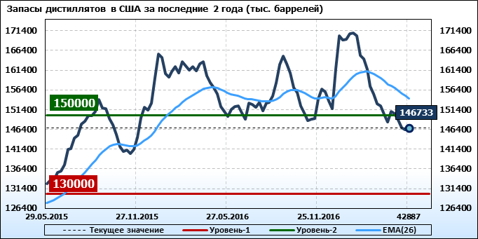 Коммерческие запасы нефти в США упали на -6.428 до 509.912 млн. баррелей. Запасы бензина упали на -2.858 до 237.024 млн. баррелей. Запасы дистиллятов выросли на 0.394 до 146.733 млн. баррелей. Запасы в хранилище Кушинг упали на -0.747 до 64.82 млн. баррелей.