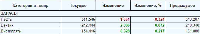 Коммерческие запасы нефти в США упали на -1.661 до 511.546 млн. баррелей. Запасы бензина выросли на 2.096 до 242.444 млн. баррелей. Запасы дистиллятов выросли на 0.328 до 151.416 млн. баррелей.