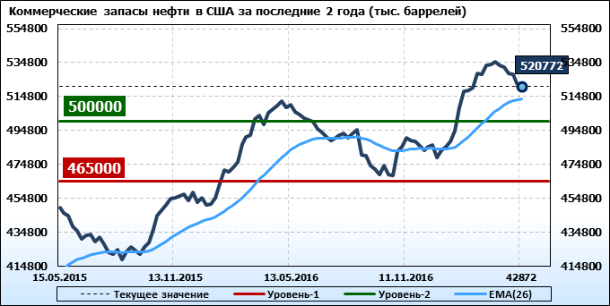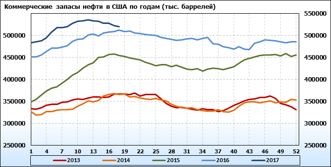 Коммерческие запасы нефти в США. Данные на 17.05.2017