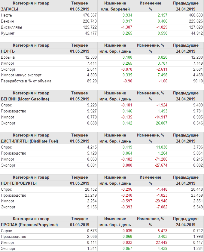 Коммерческие запасы нефти в США, EIA. Данные на 01.05.2019