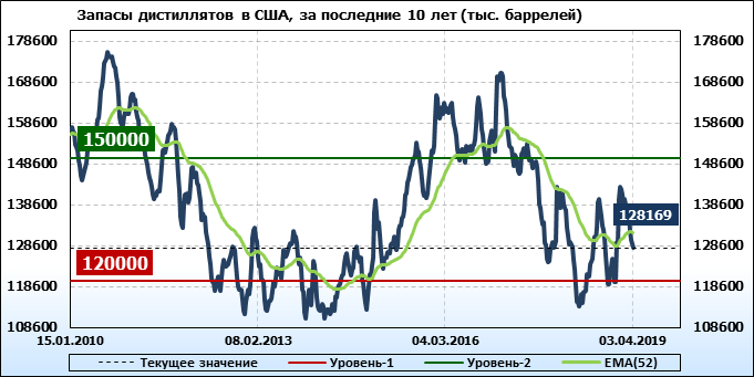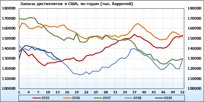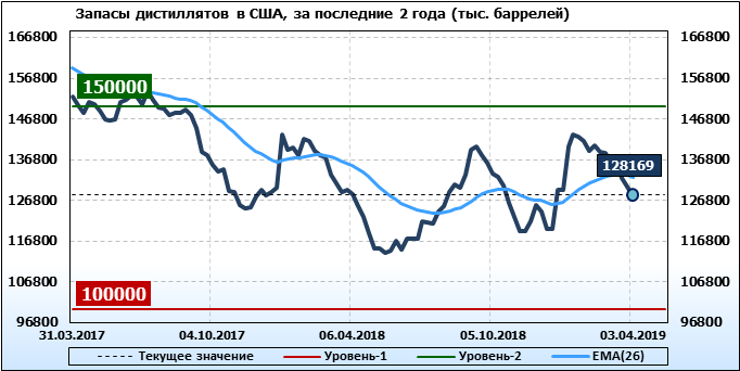Коммерческие запасы дистиллятов снизились на 1998 тыс. баррелей, достигнув 128,169 млн баррелей.