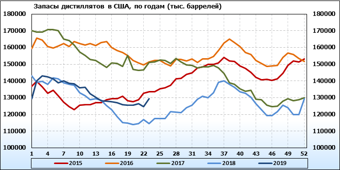 Спрос на дистилляты упал на -0.895 до 3.387 млн. баррелей. Производство дистиллятов выросло на 0.222 до 5.404 млн. баррелей. Импорт дистиллятов упал на -0.065 до 0.112 млн. баррелей. Экспорт дистиллятов вырос на 0.168 до 1.476 млн. баррелей в день.