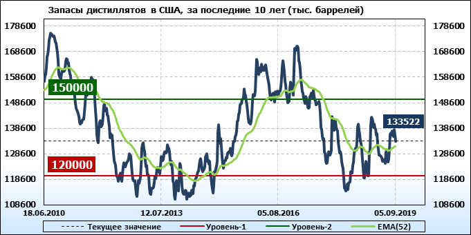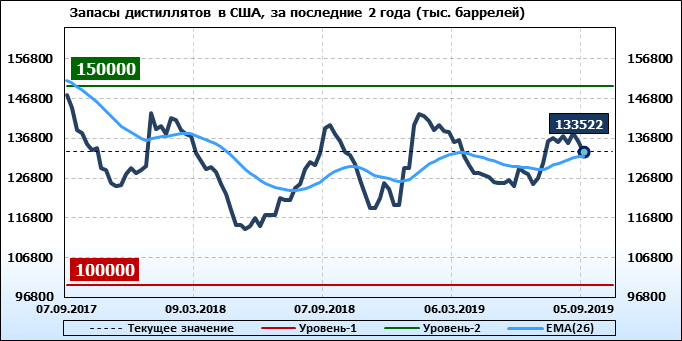 Коммерческие запасы дистиллятов снизились на 2538 тыс. баррелей, достигнув 133,522 млн баррелей.
