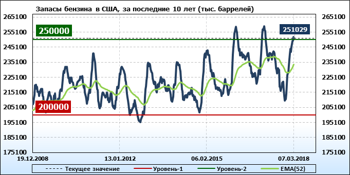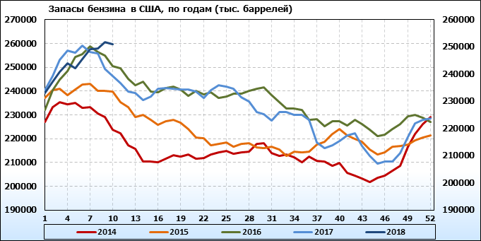 Спрос на бензин вырос на 0.416 до 9.276 млн. баррелей в день. Производство бензина выросло на 0.532 до 9.923 млн. баррелей в день. Импорт бензина вырос на 0.162 до 0.608 млн. баррелей в день. Экспорт бензина вырос на 0.224 до 0.76 млн. баррелей в день.
