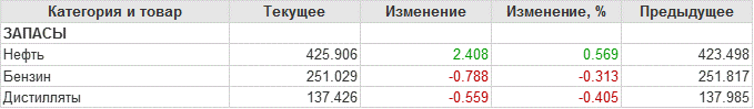 Коммерческие запасы нефти в США выросли на 2.408 до 425.906 млн. баррелей. Запасы бензина упали на -0.788 до 251.029 млн. баррелей. Запасы дистиллятов упали на -0.559 до 137.426 млн. баррелей.