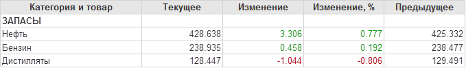 Коммерческие запасы нефти в США выросли на 3.306 до 428.638 млн. баррелей. Запасы бензина выросли на 0.458 до 238.935 млн. баррелей. Запасы дистиллятов упали на -1.044 до 128.447 млн. баррелей.