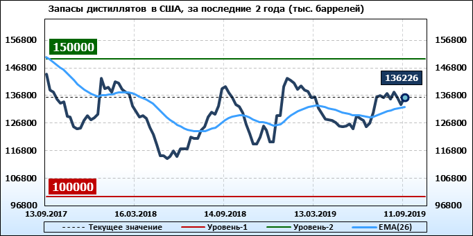 Коммерческие запасы дистиллятов поднялись на 2704 тыс. баррелей, достигнув 136,226 млн баррелей.