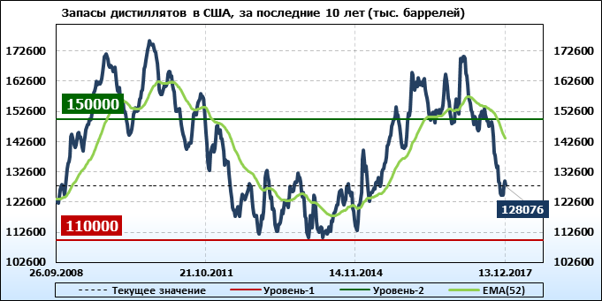 Спрос на дистилляты вырос на 0.643 до 4.38 млн. баррелей. Производство дистиллятов упало на -0.155 до 5.247 млн. баррелей. Импорт дистиллятов вырос на 0.004 до 0.149 млн. баррелей. Экспорт дистиллятов упал на -0.36 до 1.212 млн. баррелей в день.