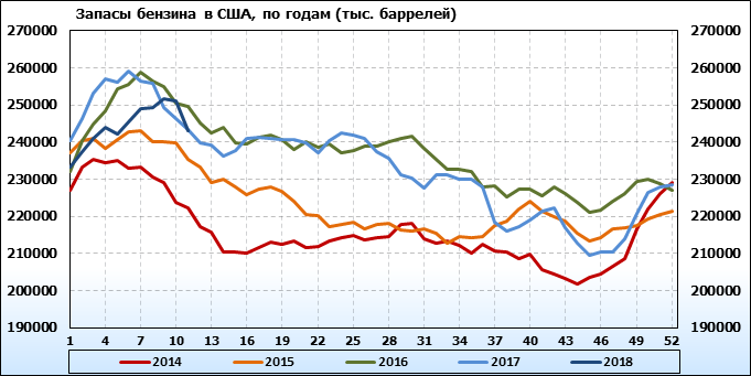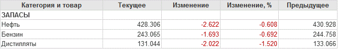 Коммерческие запасы нефти в США упали на -2.622 до 428.306 млн. баррелей. Запасы бензина упали на -1.693 до 243.065 млн. баррелей. Запасы дистиллятов упали на -2.022 до 131.044 млн. баррелей. Запасы в хранилище Кушинг выросли на 0.905 до 29.423 млн. баррелей.
