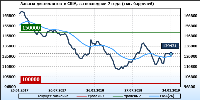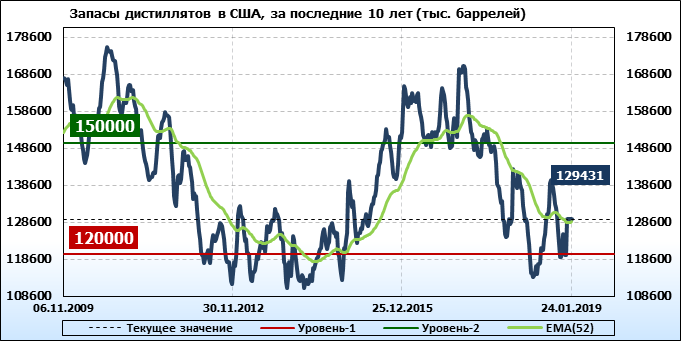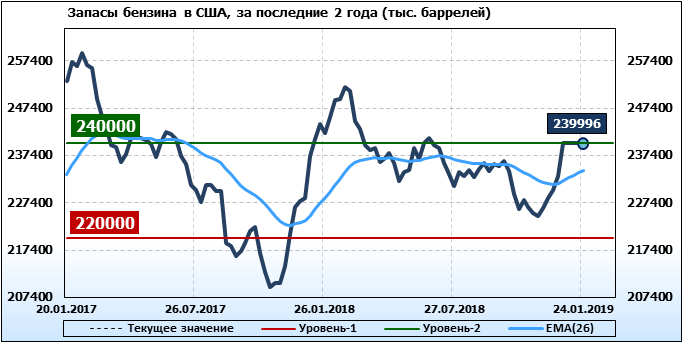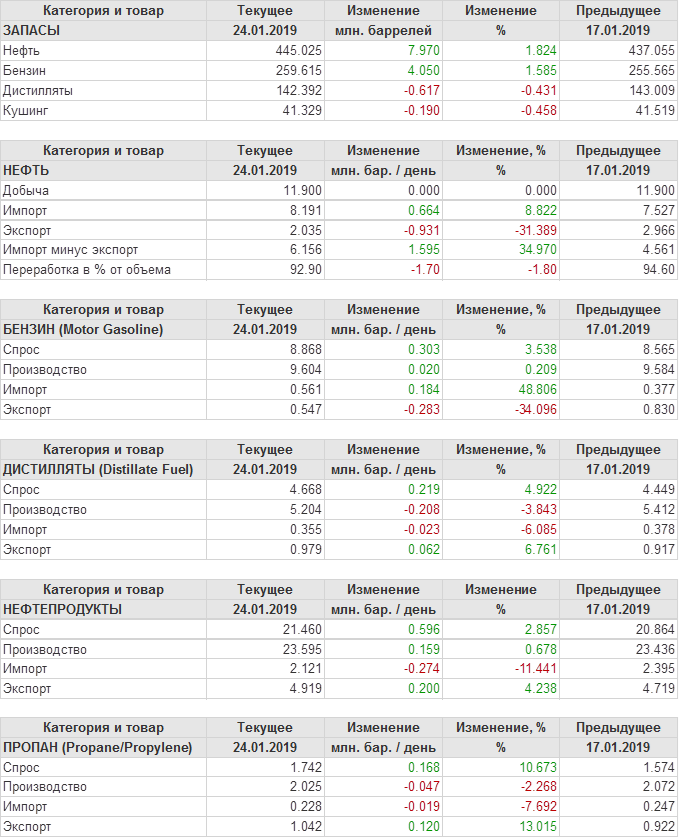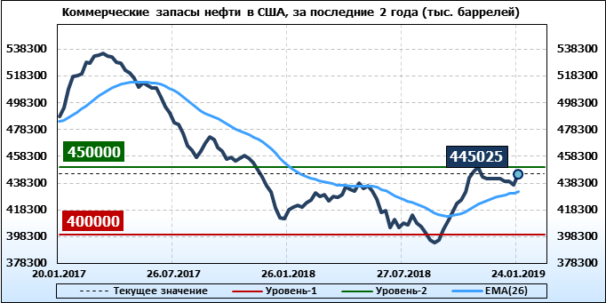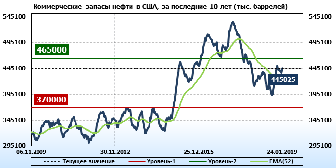 Коммерческие запасы нефти в США, EIA. Данные на 24.01.2019