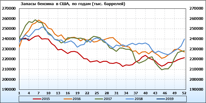Спрос на бензин вырос на 0.303 до 8.868 млн. баррелей в день. Производство бензина выросло на 0.02 до 9.604 млн. баррелей в день. Импорт бензина вырос на 0.184 до 0.561 млн. баррелей в день. Экспорт бензина упал на -0.283 до 0.547 млн. баррелей в день.