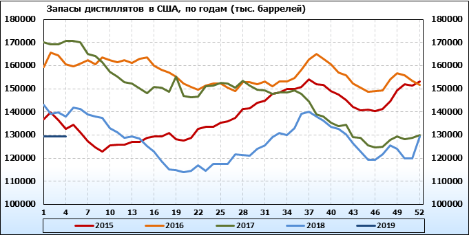 Спрос на дистилляты вырос на 0.219 до 4.668 млн. баррелей. Производство дистиллятов упало на -0.208 до 5.204 млн. баррелей. Импорт дистиллятов упал на -0.023 до 0.355 млн. баррелей. Экспорт дистиллятов вырос на 0.062 до 0.979 млн. баррелей в день.