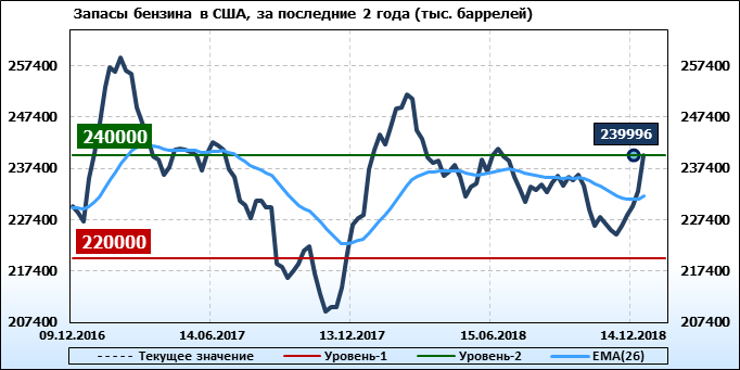 Добыча нефти не изменилась, и составляет 11.7 млн. баррелей в день. Импорт нефти упал на -0.264 до 7.392 млн. баррелей в день. Экспорт нефти упал на -0.732 до 2.237 млн. баррелей в день. Таким образом, чистый импорт нефти вырос на 0.468 до 5.155 млн. баррелей в день. Переработка нефти выросла на 2.1 до 97.2 процентов.