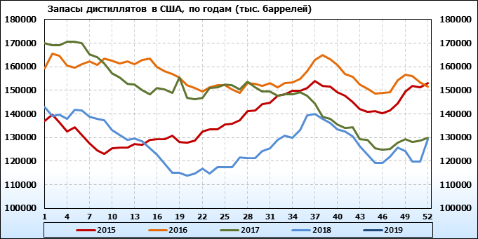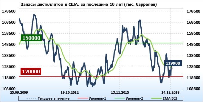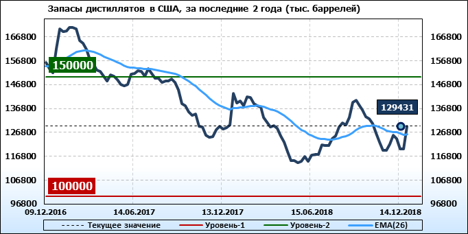 Спрос на дистилляты упал на -1.039 до 3.203 млн. баррелей. Производство дистиллятов выросло на 0.147 до 5.591 млн. баррелей. Импорт дистиллятов упал на -0.009 до 0.195 млн. баррелей. Экспорт дистиллятов упал на -0.184 до 1.222 млн. баррелей в день.