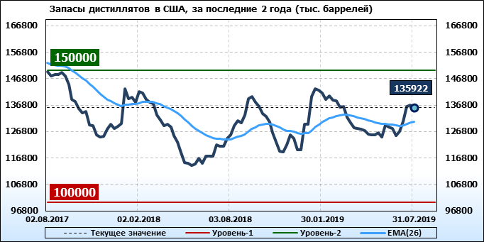 Коммерческие запасы дистиллятов снизились на 894 тыс. баррелей, достигнув 135,922 млн баррелей.