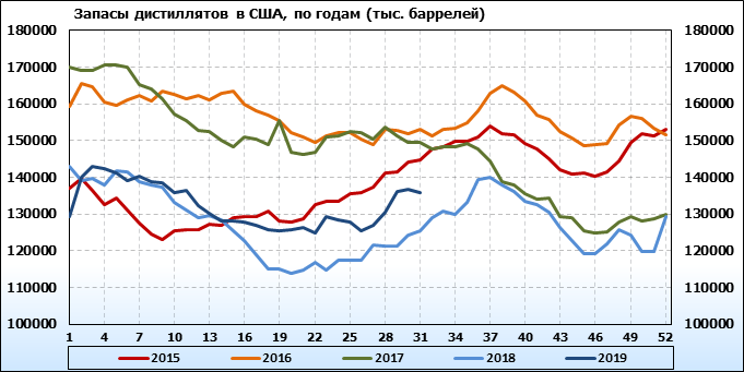 Эксперты, опрошенные агентством Bloomberg, ожидали уменьшения запасов нефти на 2750 тыс. баррелей, снижения запасов бензина на 1500 тыс. баррелей и повышения запасов дистиллятов на 1000 тыс. баррелей.