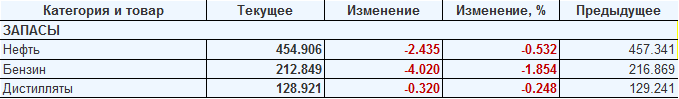 Коммерческие запасы нефти в США упали на -2.435 до 454.906 млн. баррелей. Запасы бензина упали на -4.02 до 212.849 млн. баррелей. Запасы дистиллятов упали на -0.32 до 128.921 млн. баррелей.