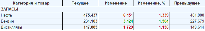 Коммерческие запасы нефти в США упали на -6.451 до 475.437 млн. баррелей. Запасы бензина выросли на 3.424 до 231.103 млн. баррелей. Запасы дистиллятов упали на -1.729 до 147.885 млн. баррелей.