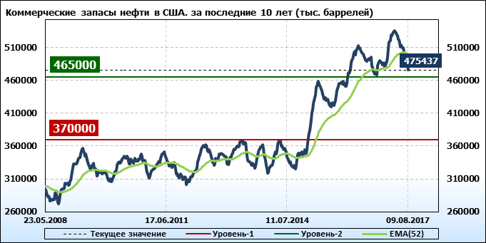 Коммерческие запасы нефти в США.EIA (U.S. Energy Information Administration). Данные на 09.08.2017