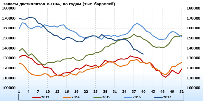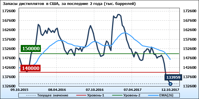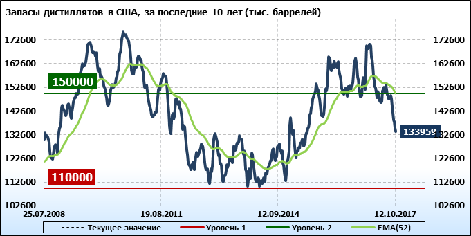 Спрос на дистилляты упал на -0.359 до 3.648 млн. баррелей. Производство дистиллятов выросло на 0.035 до 4.964 млн. баррелей. Импорт дистиллятов вырос на 0.013 до 0.085 млн. баррелей. Экспорт дистиллятов вырос на 0.246 до 1.612 млн. баррелей в день.