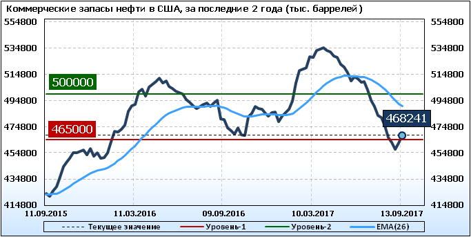 Коммерческие запасы нефти в США, EIA (U.S. Energy Information Administration). Данные на 13.09.2017