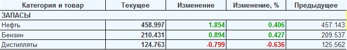 Коммерческие запасы нефти в США выросли на 1.854 до 458.997 млн. баррелей. Запасы бензина выросли на 0.894 до 210.431 млн. баррелей. Запасы дистиллятов упали на -0.799 до 124.763 млн. баррелей.