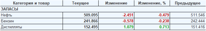 Коммерческие запасы нефти в США упали на -2.451 до 509.095 млн. баррелей. Запасы бензина упали на -0.578 до 241.866 млн. баррелей. Запасы дистиллятов выросли на 1.079 до 152.495 млн. баррелей.
