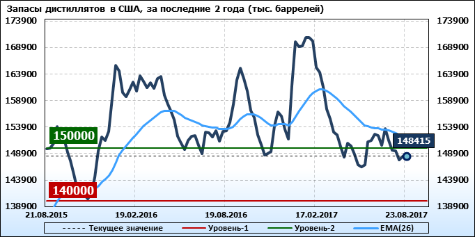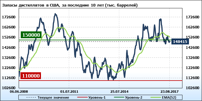 Спрос на дистилляты упал на -0.145 до 4.077 млн. баррелей. Производство дистиллятов упало на -0.196 до 5.091 млн. баррелей. Импорт дистиллятов упал на -0.035 до 0.132 млн. баррелей. Экспорт дистиллятов вырос на 0.01 до 1.142 млн. баррелей в день.